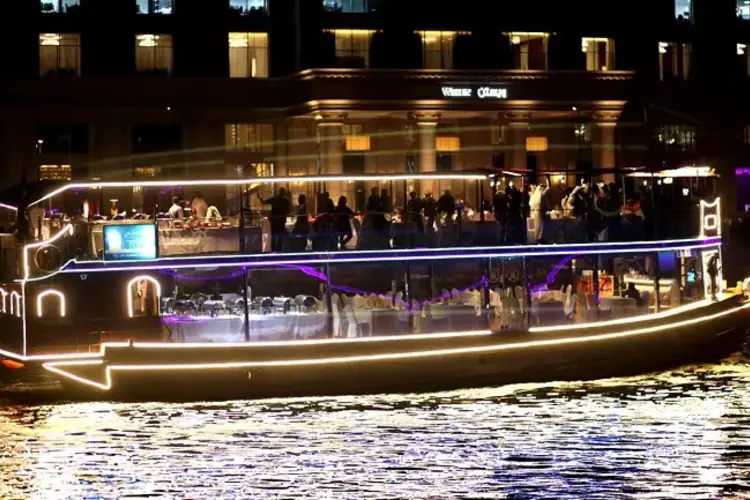 رحلة مائية لمدة ٤٥ دقيقة تمر عبرها بأبراج دبي المتميزة، وشلال جسر شارع الشيخ زايد، وجسور على طول قناة دبي المائية على متن عبرة حديثة ذات تصميم تراثي تعمل بمحرك البترول.