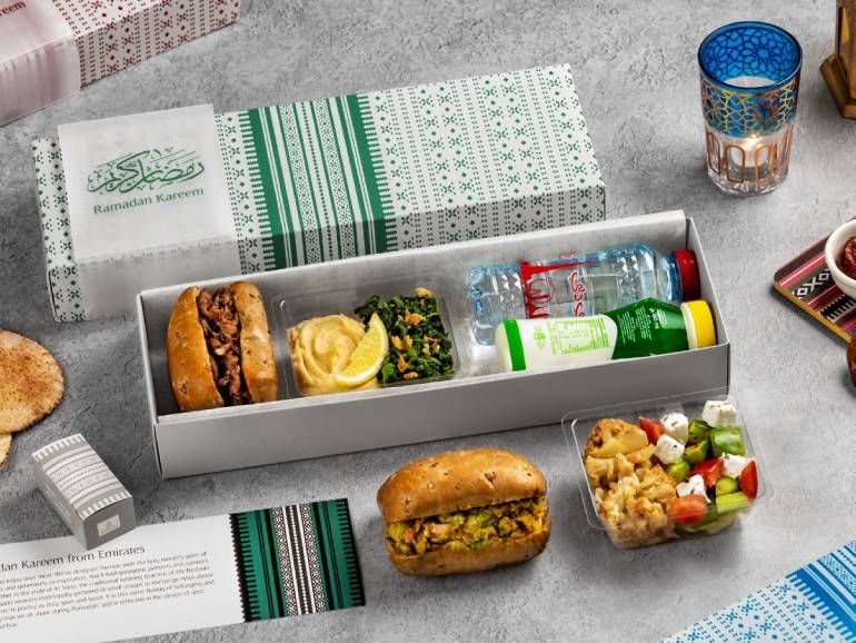 Emirates wird während des Ramadan in seinen Lounges am Dubai International Airport traditionelle arabische Desserts, Datteln und Kaffee servieren. Zu den Mahlzeiten in der First und Business Class gehört eine Auswahl an warmen und kalten arabischen Vorspeisen und Linsensuppe, zu den Hauptgerichten arabische Grillgerichte mit Tahina und Hähnchenhebel mit Band und Rita, und zu den Desserts Nafas mit Pistaziencreme, Bisbusa mit Safran, Sahne und Walnüsse, Eis mit arabischen Kaffeearomen, Datteln oder Baklavas sowie eine Reihe weiterer traditioneller arabischer Desserts und Gebäckstücke.