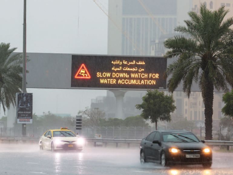 Die Vereinigten Arabischen Emirate wurden am Dienstag von heftigen Regenfällen und starken Winden heimgesucht. Das Wasser blockierte viele Straßen und verwandelte die Landebahn des Flughafens Dubai in ein „Meer“.
